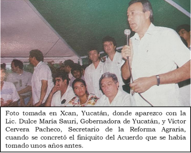 Teniendo como objetivo terminar con ese problema, inicié pláticas con el Gobernador de Yucatán, Lic. Víctor Manzanilla Schaffer, quien estuvo de acuerdo en buscarle solución a esa situación. /El Lic. Manzanilla Schaffer dejó el cargo y le sucedió la Lic. Dulce María Sauri Riancho, quien coincidió en continuar implementando la solución al problema. Del mismo modo apoyó el Gobernador Víctor Cervera Pacheco, que también actuó como Secretario de la Reforma Agraria para resolver las irregularidades ya citadas.